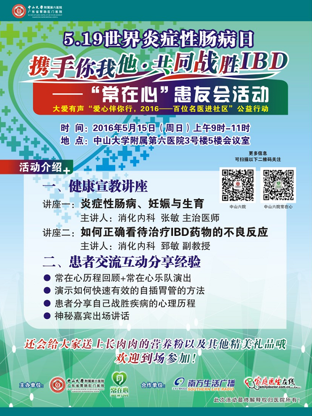 【活动预告】5·19世界炎症性肠病日“携手你我他,共同战胜IBD”——“常在心”患友会活动 2016-05-13 医院公告 阅读: 上一篇: 【活动预告】全民营养周健康宣讲义诊活动 下一篇: 【节目预告】《直播广州》之中老年人也要注重减肥吗?