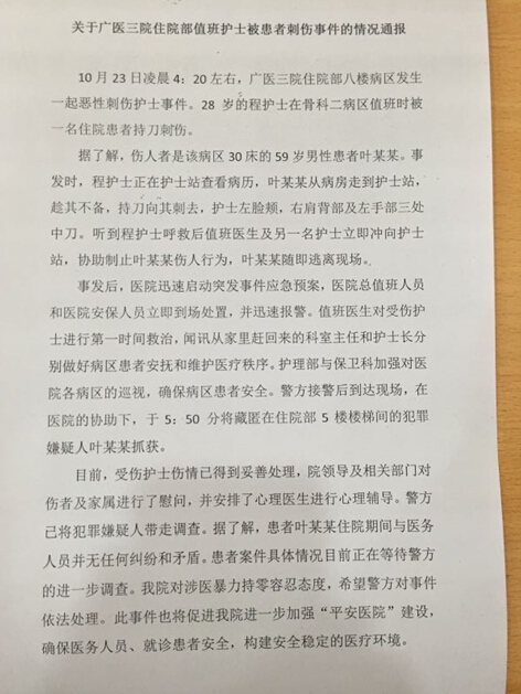 在广医三院第一时间发布的通告中,对于事件有了真实的还原:今日凌晨4:20左右,广医三院28岁的护士程某在骨科二病区值班时被一名住院患者持刀刺伤。事发时,护士程某正在护士站查看病历,叶某某从病房走到护士站,趁其不备,持刀向其刺去。护士左脸颊、右肩背部及左手部三处中刀。