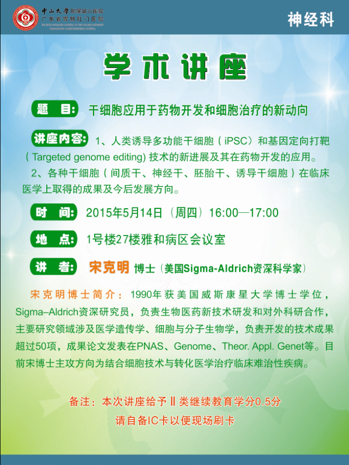 【学术讲座】干细胞应用于药物开发和细胞治疗的新动向(神经科) 2015-05-11 医院公告 阅读: 上一篇: 【节目预告】名医面对面之科学减重,还您健康人生 下一篇: 【福利放送】小胖们,中山六院来送福利啦!