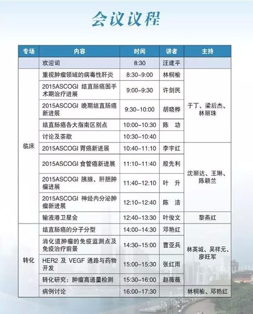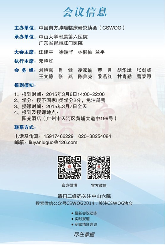 胃肠道肿瘤包括结直肠癌、胃癌、肝癌、食管癌,其发病率均位于我国恶性肿瘤的前五位。为了让国内胃肠道肿瘤同行更及时、充分地了解相关知识,由中国南方肿瘤临床研究协会(CSWOG)主办,中山大学附属第六医院(广东省附属胃肠肛门医院)承办的2015 POST ASCO GI会议定于2015年3月7日在美丽的花城广州隆重召开,本次会议将邀请多位国内著名专家就2015 ASCO GI会议精彩内容进行解读,会议设三个专场,分别是临床进展专场、转化研究专场及病例讨论专场,欢迎从事胃肠道肿瘤诊疗的医务人员积极参与!