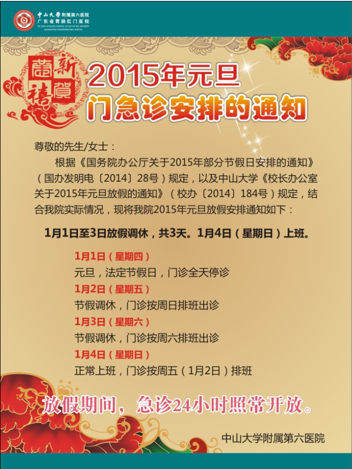 【温馨提示】2015年元旦门急诊安排的通知 2014-12-30 医院公告 阅读: 上一篇: 2015年上半年周六、周日胃肠专科门诊出诊专家表 下一篇: 【温馨提示】《广爱基金重疾防治白皮书》可在我院领取