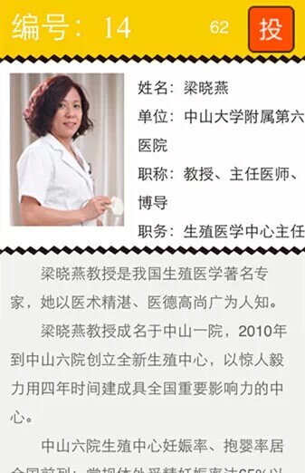 目前,经过各医院报送、自荐及同行间互评两轮筛选,我院生殖医学中心主任梁晓燕进入大众微信投票环节,希望大家能够动动手指,投上宝贵的一票。