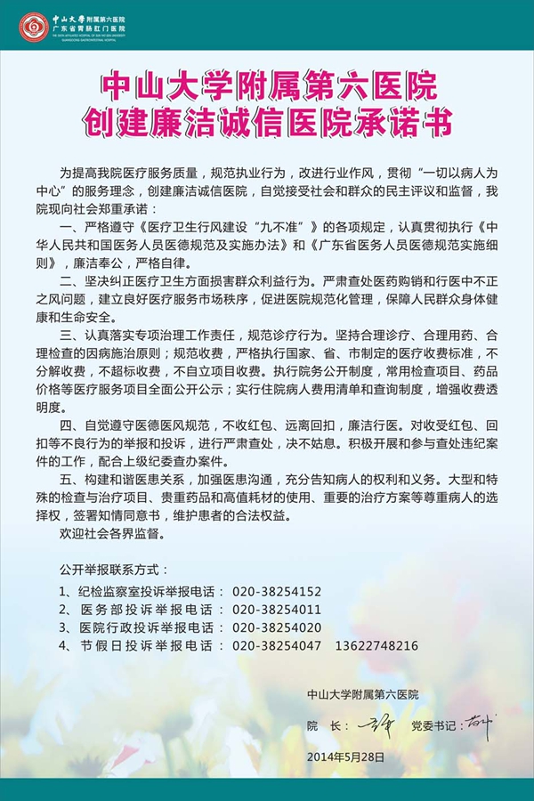 中山大学附属第六医院创建廉洁诚信医院承诺书