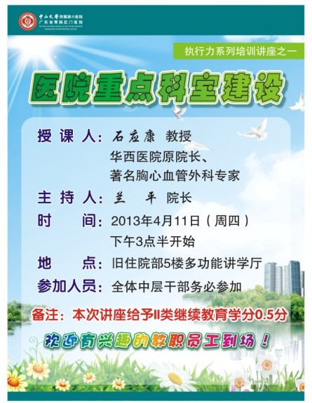 石应康教授《医院重点科室建设》——执行力系列培训讲座通知