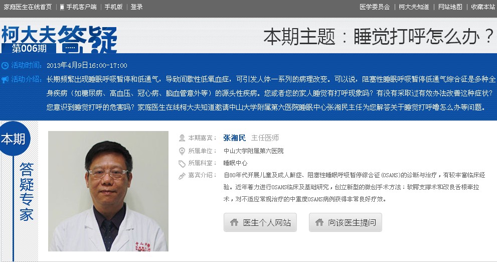 家庭医生在线柯大夫知道答疑栏目——睡觉打呼怎么办? 预告