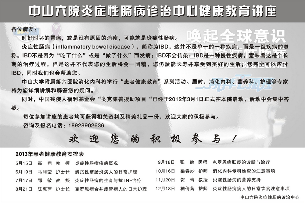 炎症性肠病中心系列健康教育讲座预告 2013-05-14 医院公告 阅读: 我院炎症性肠病诊治中心将于5月起,在每月第三个星期的星期三下午三点开始举办系列健康教育讲座,详情请参阅海报内容 上一篇: 5月17日柯大夫答疑预告——痔疮是怎么引起的 下一篇: 5月7日柯大夫答疑预告——哮喘是能够控制的