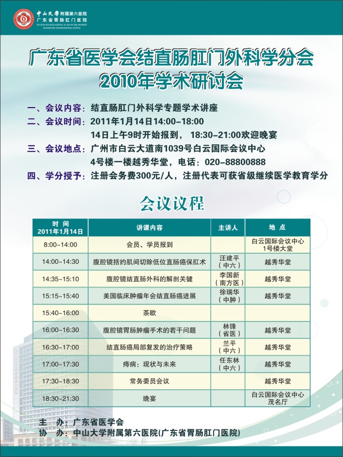 广东省医学会结直肠肛门外科学分会2010年学术研讨会会议通知 2011-01-11 医院公告 阅读: 上一篇: 2010广东省医学会结直肠肛门外科学分会学术年会 下一篇: 中山大学附属第六医院关于公开招聘合同收费员的启事