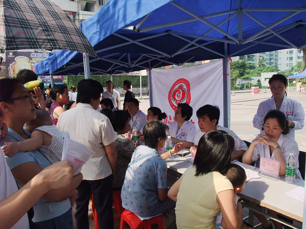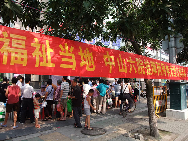 8点,在员村二横路上,就已经可以很鲜明的看到“以人为本 福祉当地 中山六院挂牌两周年大型义诊活动”的横幅。此次义诊活动由医务科牵头,党政办、总务科和社区卫生服务中心等其他相关职能科室也早早的就来到现场布置。在布置过程中,已经不少的市民上前询问什么时候开始活动,也有市民看到专家的名牌后惊呼怎么大主任也来义诊呢,待会一定过来。