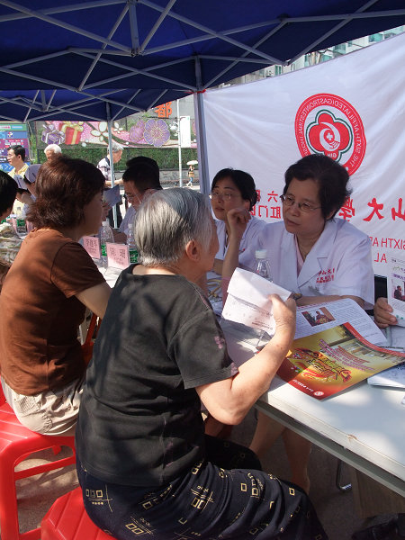 9点义诊正式开始,各个专家前面一下子就排起了队伍,除了不少白发苍苍的老人家,更有一些年轻人也加入了健康咨询的行列。量血压两位护士异常忙碌,她们一面测量血压,一面做登记记录,一面解答人们的一些问题。工作人员们也开始派发医院挂牌两周年单张、医院简介、健康手册等宣传资料,并帮忙引导人们,整个现场热闹而又有序。