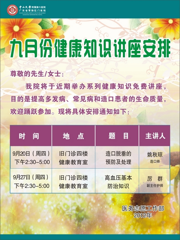 九月份健康讲座安排