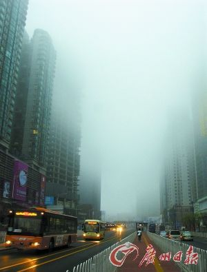 昨天早晨,广州市区被大雾包围,能见度极低。图为雾中天河。