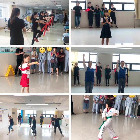 一切准备就绪,慷慨激昂的院歌吸引了各位患者前来观看表演;我院康复医学科快闪探访服务队的成员们运用Flexi-bar、弹力带为患者带来的动感十足并带有康复医学特色的舞蹈,让患者颇感新奇,甚是欢喜;员村小学学生们献上了富有动感、舞步摇曳多变的拉丁舞,音色轻柔细腻、圆润质朴、极富表现力的葫芦丝演奏,抑扬顿挫、声情并茂且铿锵有力的吟诵,有着排山倒海气势的跆拳道表演;院内志愿者带来的动听歌曲也让人觉得倍加温暖……众多精彩的表演,让患者们意犹未尽,掌声阵阵,纷纷用手机记录下这些暖心的精彩瞬间。
