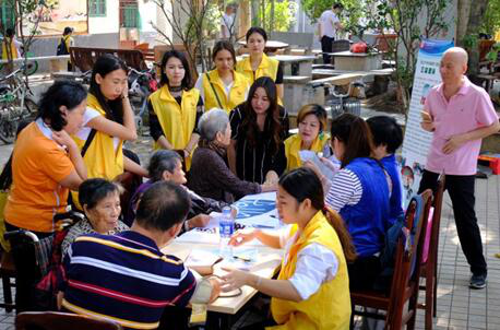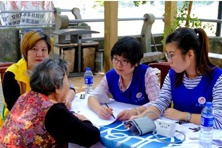 下午1点左右,我院志愿者与暖加公益的志愿者来到增步村,这个坐落于荔湾的村落,早已充溢着节日氛围。村广场中,义剪服务团队已开始服务,待我们医疗志愿者布置好义诊摊位,老人们已迫不及待地在义诊台前排起了长队,接受志愿者们测量血压服务,并进行简单的健康咨询。