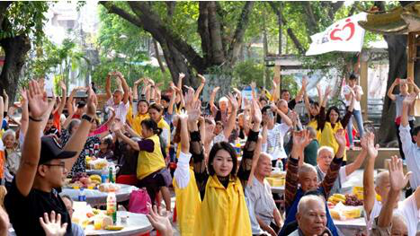 随着老人们的陆续到来,广场的重阳节老人茶话会也临近开场。我院康复医学科李娴作业治疗师和志愿者走上讲台。带领现场的老人们做起了运动指导操,总共三组包括牵伸运动、肌力训练及平衡训练元素的共十二个动作,主要帮助老人进行简单的日常运动,增益健康。场下的老人们,在义工的帮助下,兴致勃勃地认真跟学,广场中充满了节日的欢声笑语。