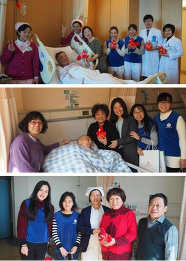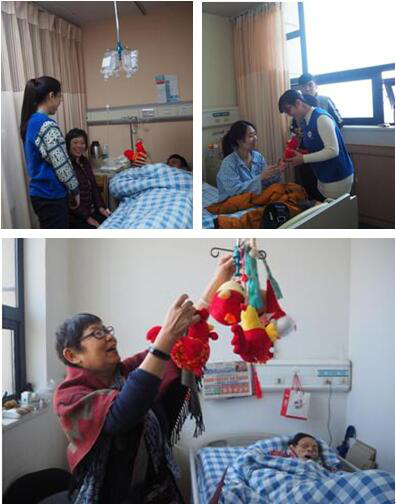 患者和家属们收到探访礼物“福鸡公仔”,都喜笑颜开,也为前来探访的医护人员与志愿者送上节日祝福,表示感谢,不少患者和家属纷纷要求和医生、志愿者们合影留念,记录下这欢乐喜庆的一幕。