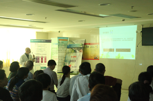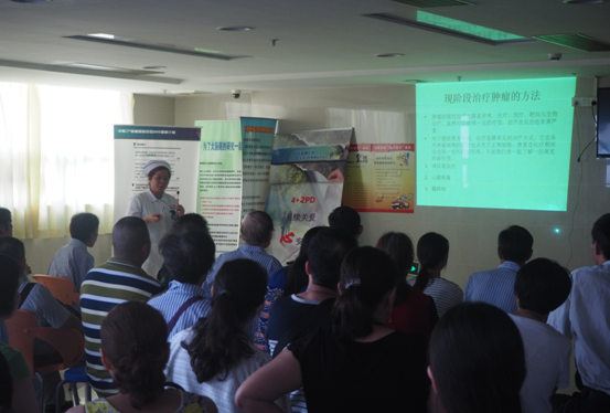 本期活动除了邀请医护嘉宾曹泰源医生和甘肖勤护长分别做以《如何轻松止痛》以及《关注肿瘤病人生活质量》为主题的健康讲座,同时也邀请了至今仍在我院接受治疗的直肠癌病友、华南师范大学政治与行政学院的郭老师,分享了他在治疗期间的一些经历和感想。郭老师作为一个癌症病友,结合自己的经历,分别就其病前对癌症的认识与接触、癌症降临的心态与行为调整、放化疗中出现的几个状况及处理以及饮食调整配合治疗几个方面,和众多的病友和家属分享了他的治疗故事,并且鼓励病友们调整好心态,积极配合治疗。他希望自己能以患者志愿者的身份,继续为病友们做一些事情,传递正能量。