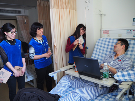 此次探访,医务志愿者们带上了颇具中国传统特色的“羊年剪纸”作为新春礼物,送到各个病区患者手中,并送上羊年的美好祝愿。病人们收到这特别的礼物,都充满惊喜!对着这份有着精美的剪纸礼物细细端详,并连声感谢!同时也为在场的志愿者们、医护人员送上了自己的新年祝福,相互之间拜了个早年!
