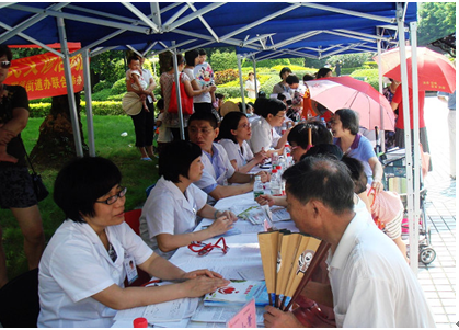 天河区副区长郑丹群、区民政局局长饶洁怡等领导到场参与了启动仪式。伴随着仪式上文艺节目的落幕,在与街道办联合摆设的咨询服务台前,大批小区居民逐渐围拢了过来。尽管天气炎热,但丝毫没有影响医疗人员为群众服务的热情,骨科苏汝堃主任医师的咨询台前还排起了长队。医务志愿者们认真的给居民量血压,测血糖,测骨密度,不厌其烦的解答关于疾病、保健方面的各种问题。他们表现出来的专业知识和亲切的服务态度赢得了居民深深的信赖,受到一致好评。社区居民们对中山六院也有了更加深刻的了解和认识。
