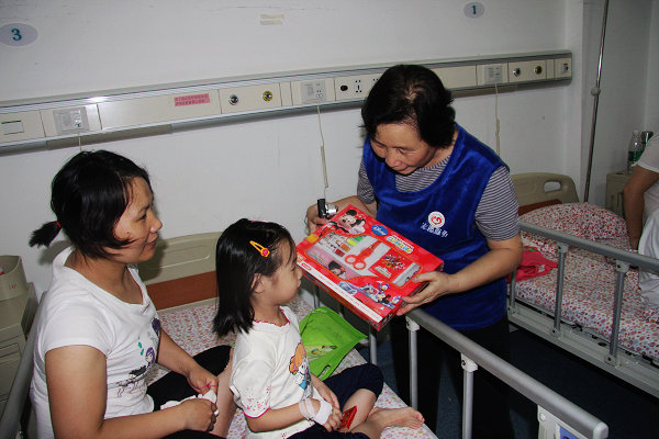 (医务志愿工作部 讯)6月1日是儿童欢庆的日子,尽管烈日炎炎,当天下午,由医院医务志愿部组织,包括85岁的老志愿者洪老师在内的多名医务志愿者到儿科、骨科、外四科等科室探访了正在住院的小朋友,他们中最小的才1岁,最大的14岁。