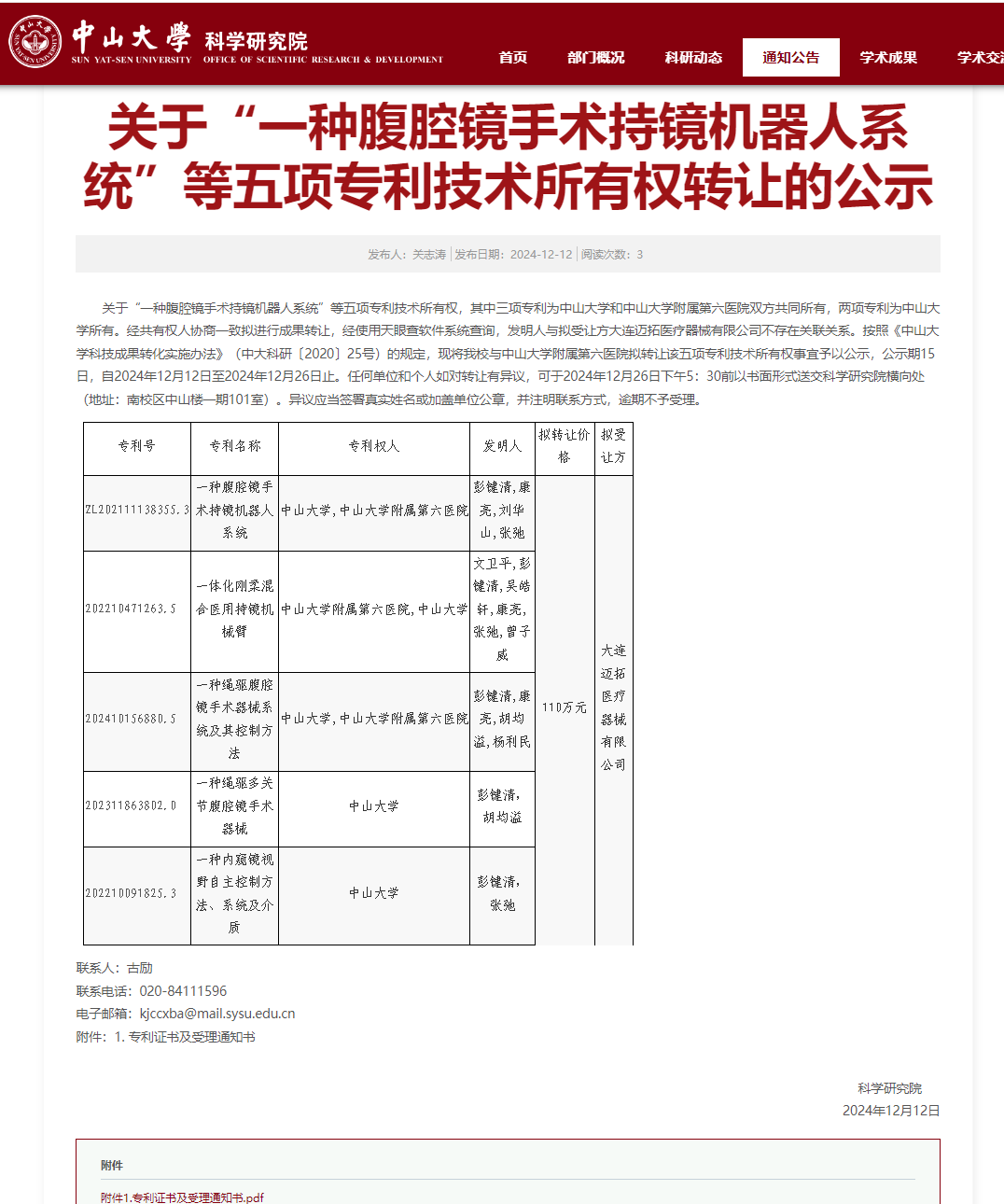 按照《中山大学附属第六医院科技成果转化实施办法(试行)》(附六〔2021〕12号)的规定,现将“一种腹腔镜手术持镜机器人系统”等五项专利技术所有权转让予以公示,其中三项专利为中山大学和中山大学附属第六医院双方共同所有,两项专利为中山大学所有,公示期15日,自2024年12月12日起至12月26日止。