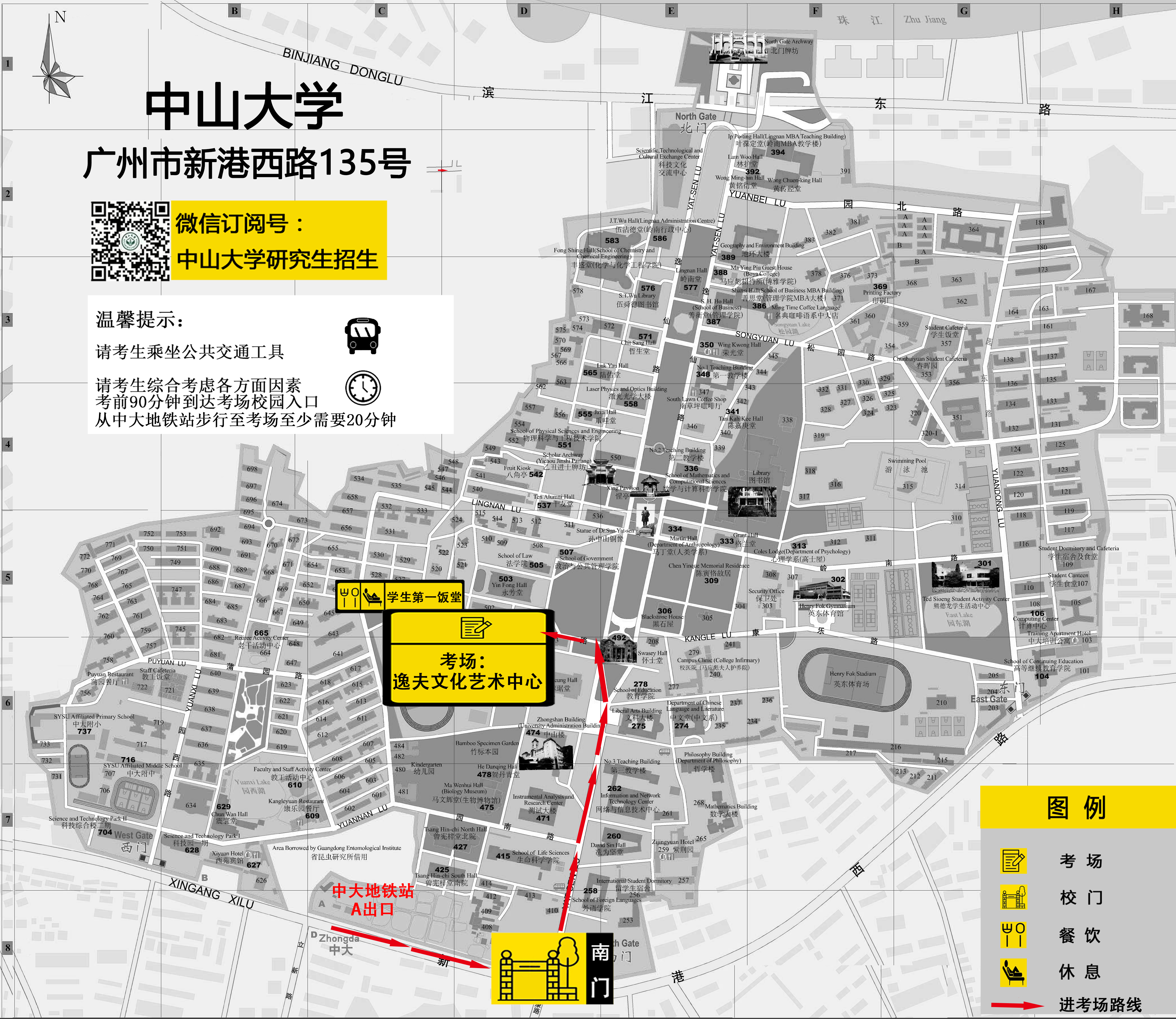 1.考生可从中山大学广州校区南校园的南门(新港西路)进出校园。